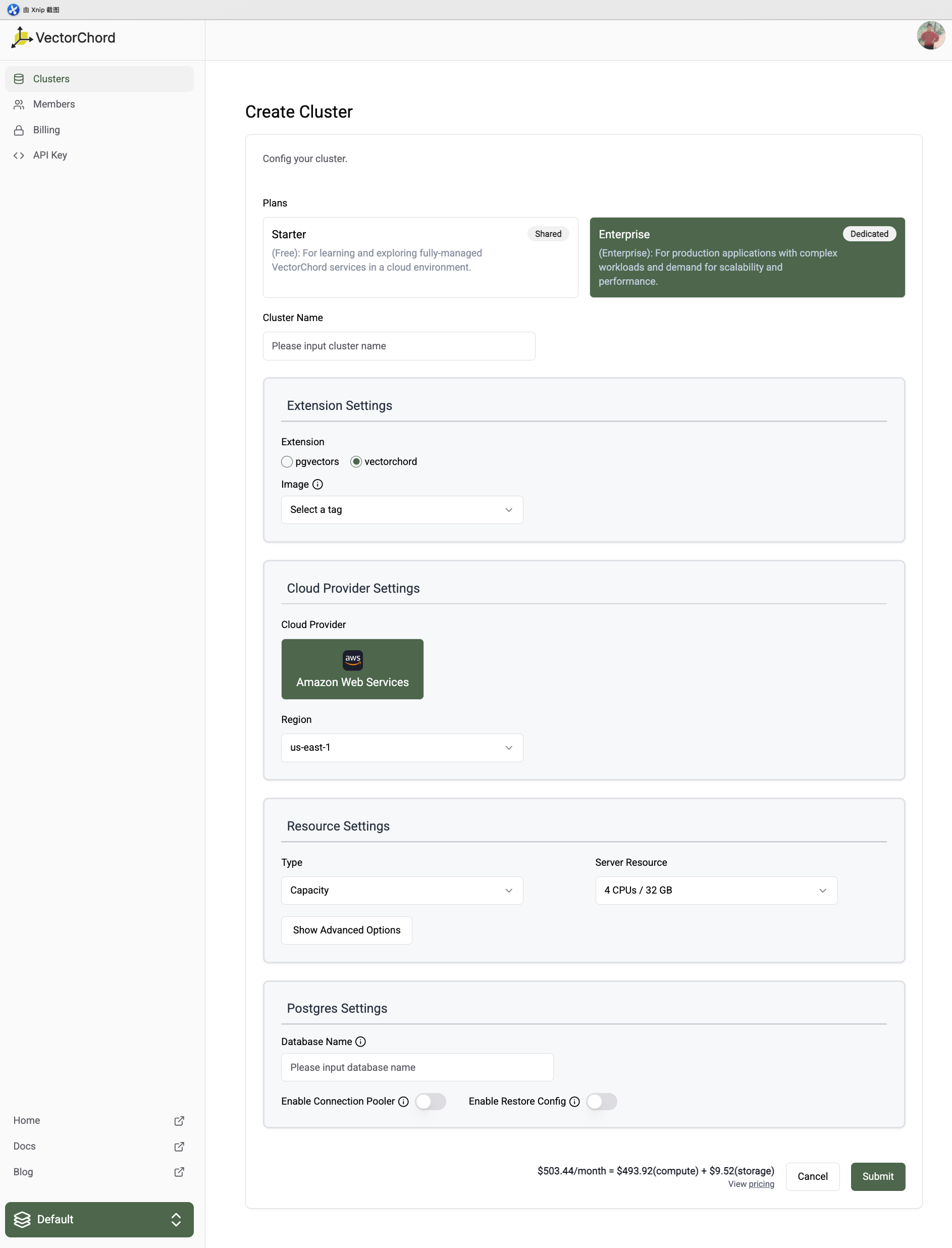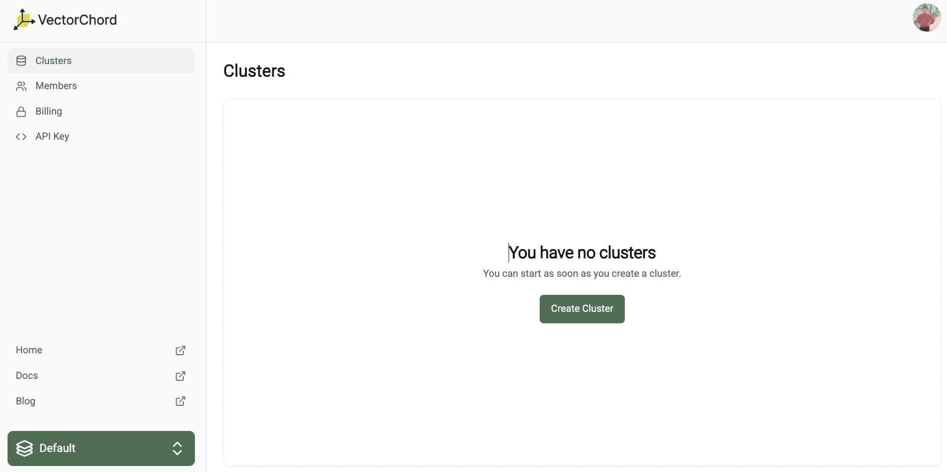 To create a new cluster, navigate to the VectorChord Cloud Console and click on the "Create Cluster" button.