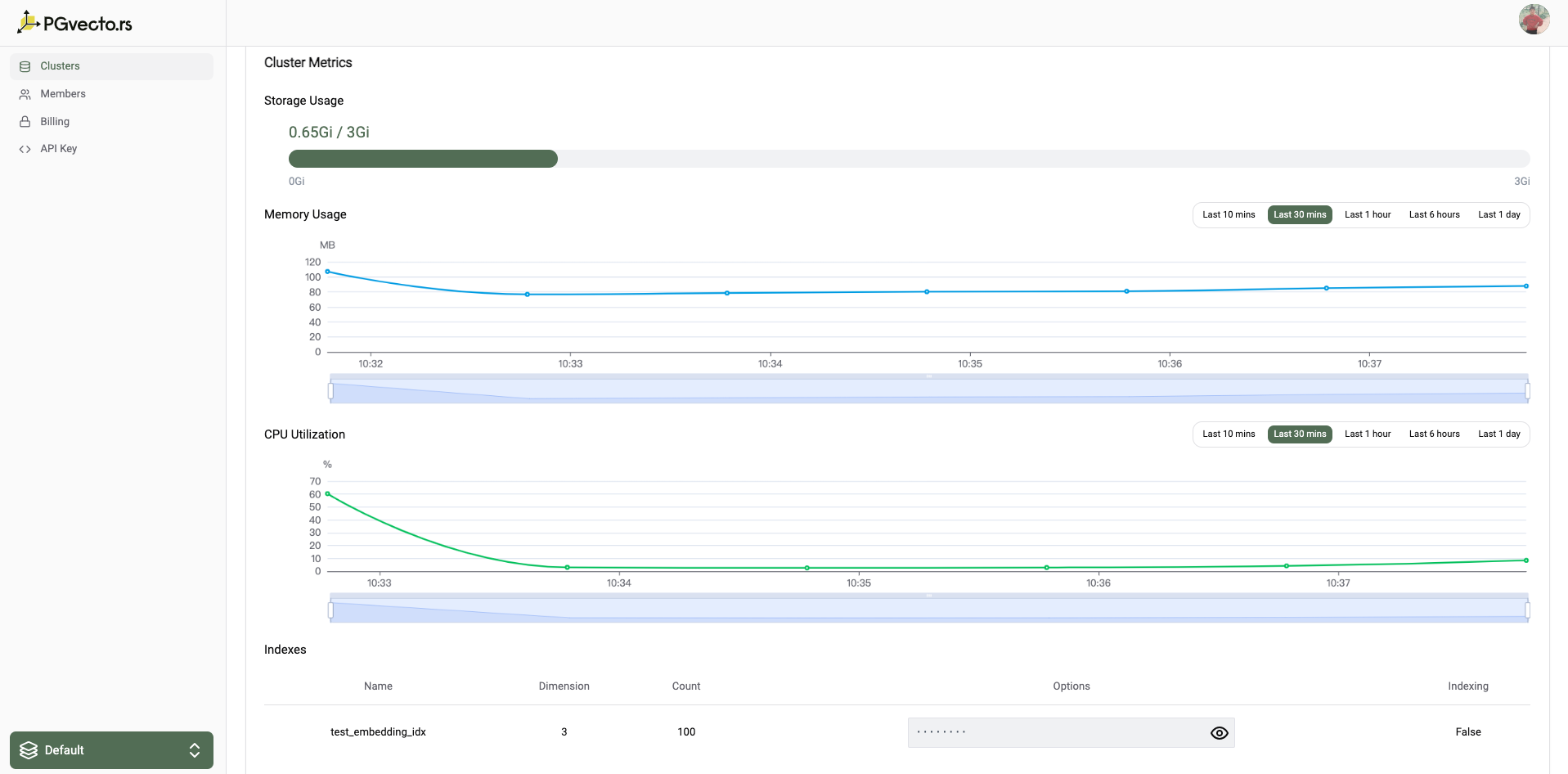 You can view the cpu utilization, memory usage and PGData disk total and usage of your cluster in the metrics page. And you can also view the index info for example the number of vectors in the index, the dimension of the vectors etc. For detailed information about monitoring, see Monitoring.